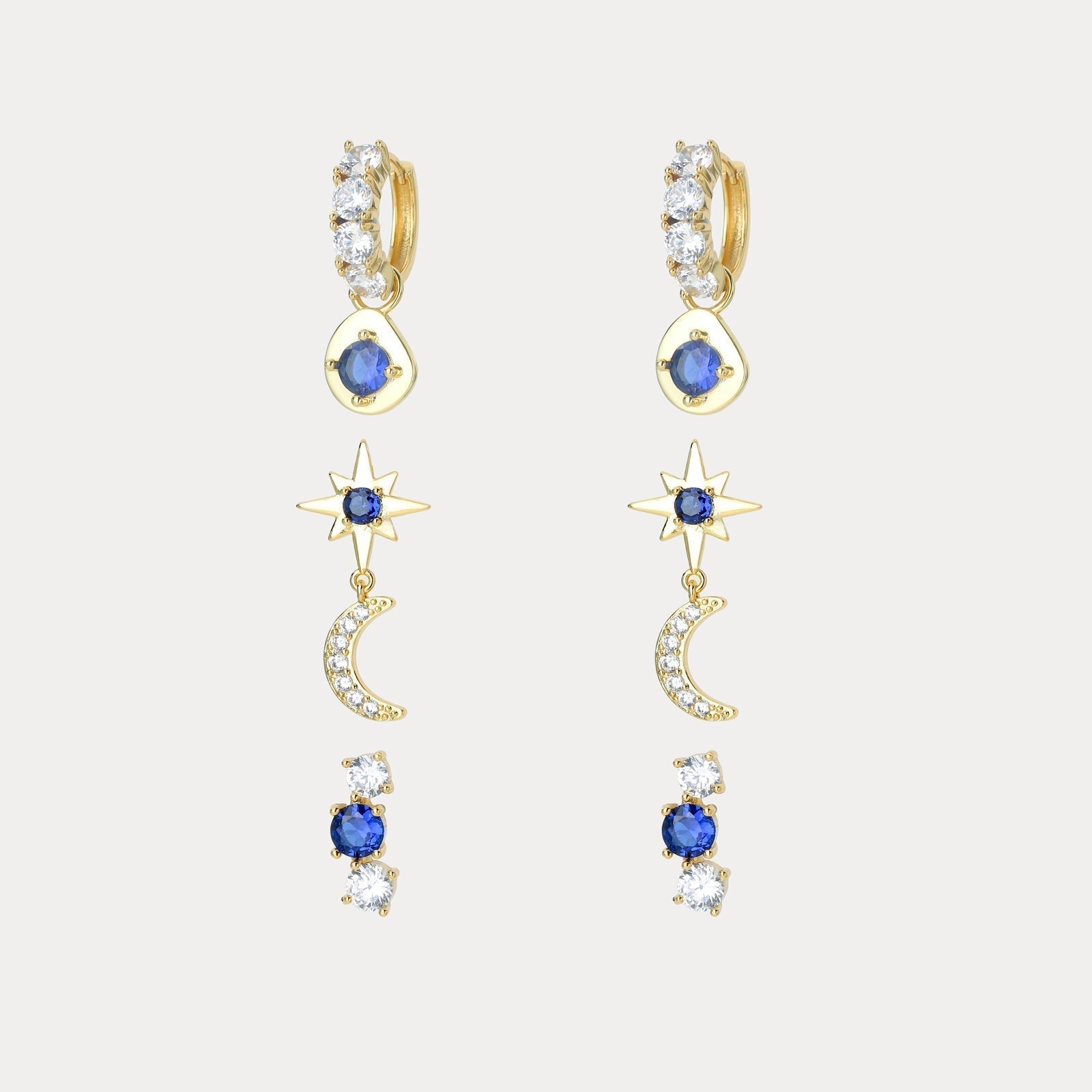 This set includes three pairs of earrings featuring sparkling white and deep blue stones shaped like stars and moons, symbolizing hope, brilliance, serenity, and protection. Perfect for everyday wear, special occasions, or as a thoughtful gift, these earrings add a touch of charm and mystique to any outfit.